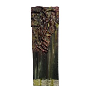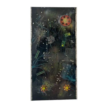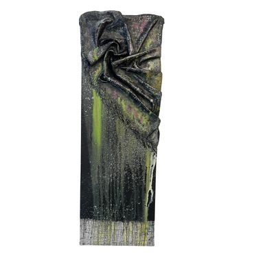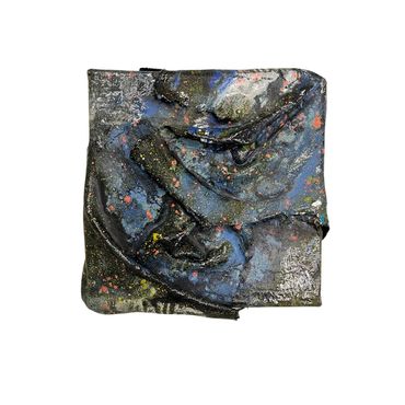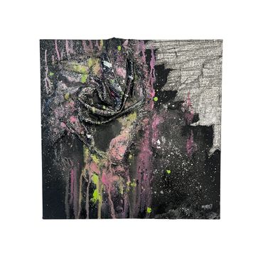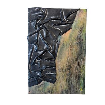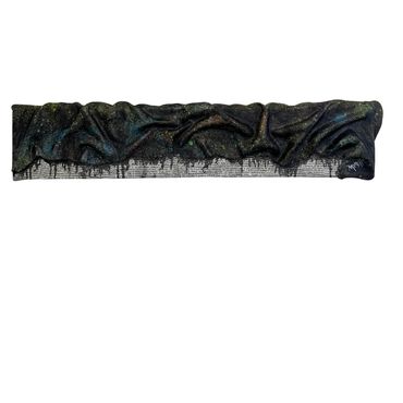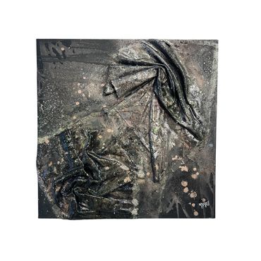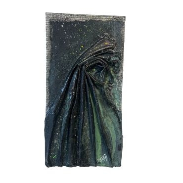 Œuvre d'art caractère, texture de papier de sois peint noir au fond turquoise.